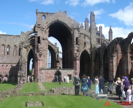 The Gothic-style ruins of the Melrose Abbey, in Melrose, Scotland, set the scene for the beautiful Easton/Tubby wedding ceremony. The mid-afternoon sun took away a bit of the chill from the outdoor ceremony, and despite the lack of roof or enclosing structure, the sound of the harp carried throughout the abbey.